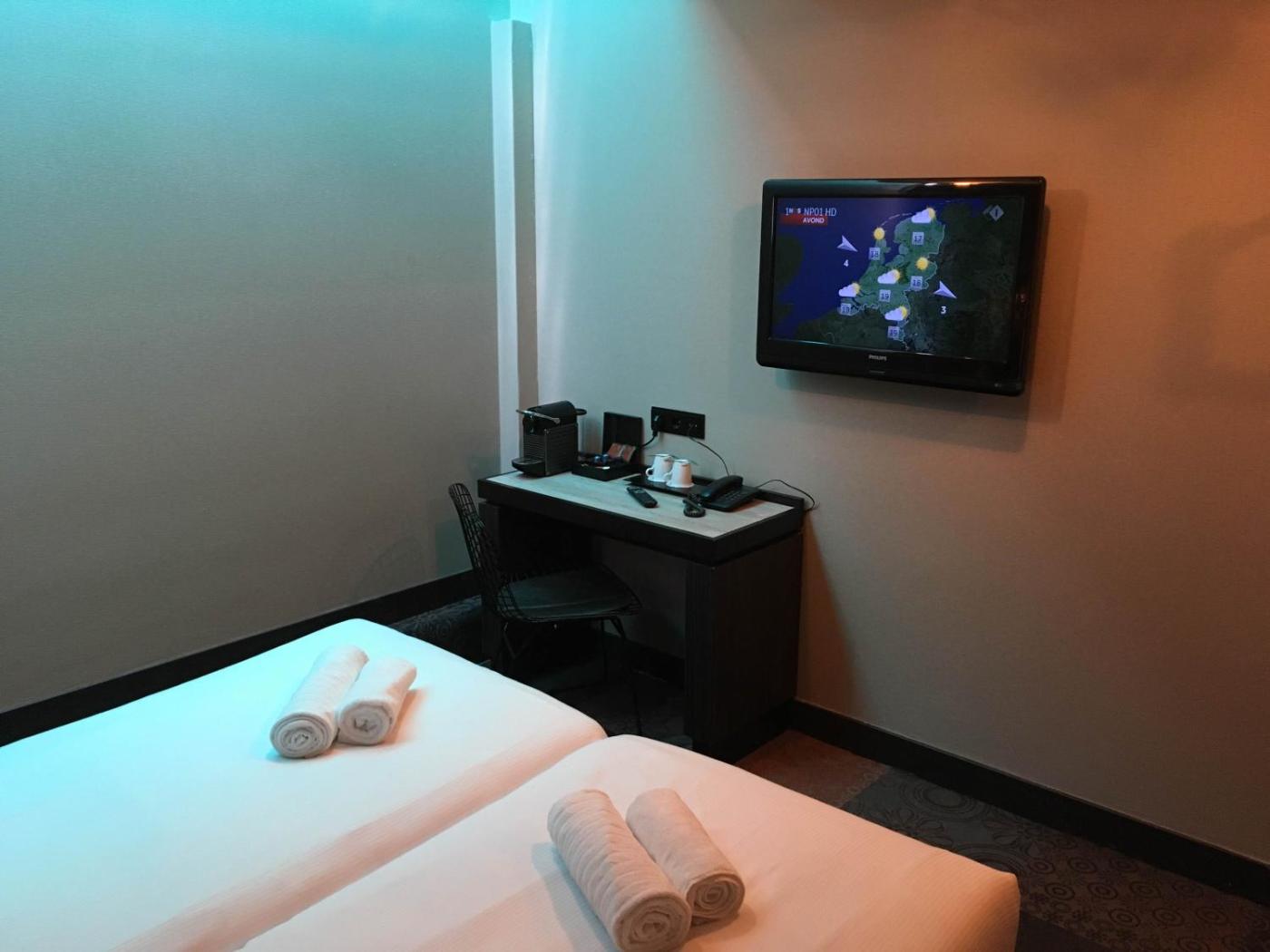 Twin Room. The twin room features air conditioning, a tea and coffee maker, as well as a private bathroom boasting a shower and a hairdryer. The twin room offers a wardrobe, a safe deposit box, a carpeted floor, heating and a flat-screen TV. The unit has 2 beds. ;
