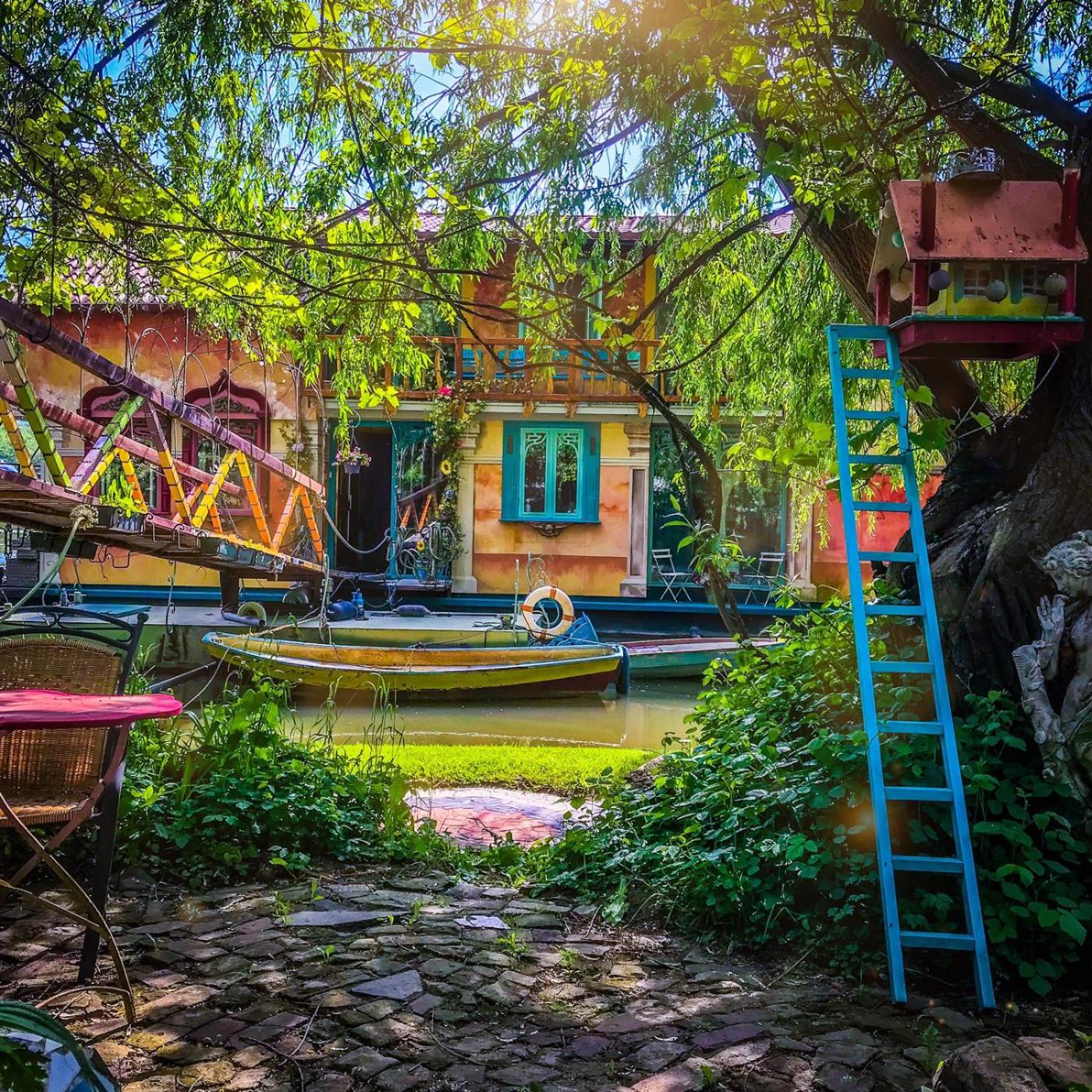 In the spacious mosaic garden, guests can enjoy a cold drink from the communal fridge. There are waterside seating cornersducks and birdsthe guests.