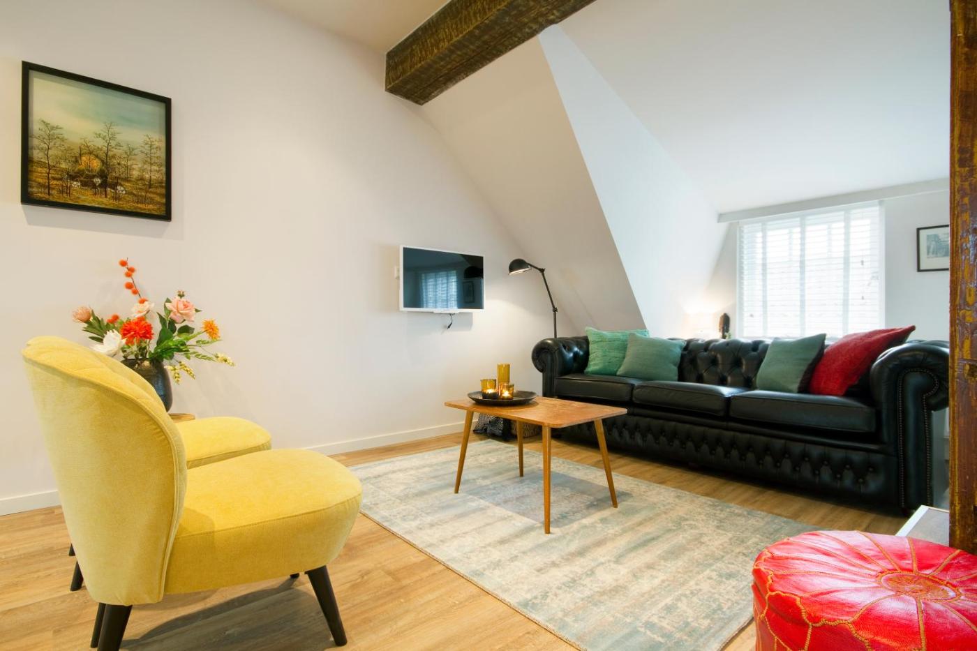 Studio Apartment. This studio has a separate sleeping area behind a half-height wall with a double bed. In the living room, a double sofa bed is located. The fully-equipped kitchen has a combi-oven, a Nespresso coffee machine and a kettle. Both the living room and the sleeping area are equipped with a flatscreen TV. Free Wifi is offered. Bed linen and towels are included in the rate.