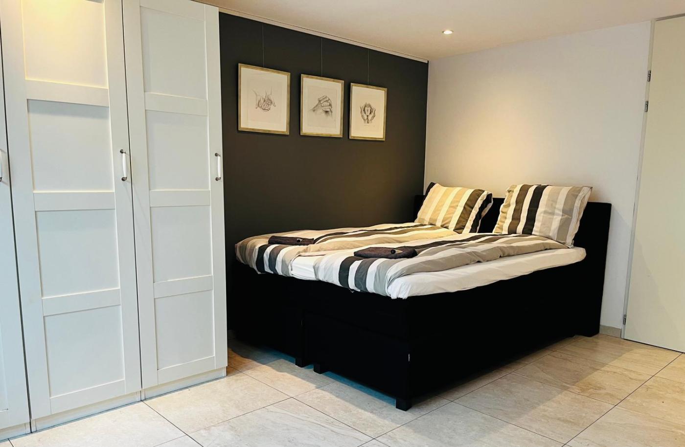 The spacious studio has a living area with a large dinner table. There are two double sized beds and one bunkbed. There is a separate bathroom with shower, toilet and a washing machine.