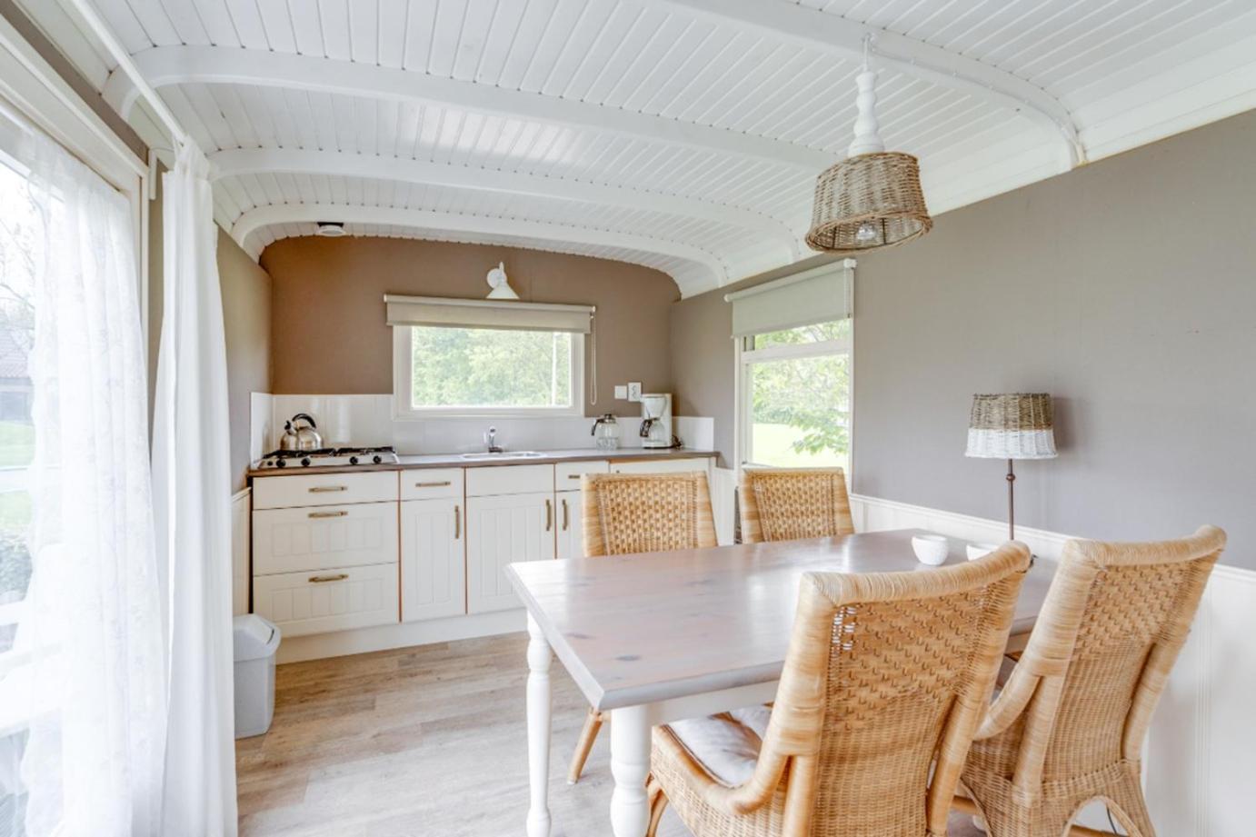 The units have a fully equipped kitchen with dining area, a fridge, coffee machine, and a stovetop. For added convenience, the property can provide towels and linens for a supplement. Guests can grab a bite to eat in an outdoor dining area at the campground.