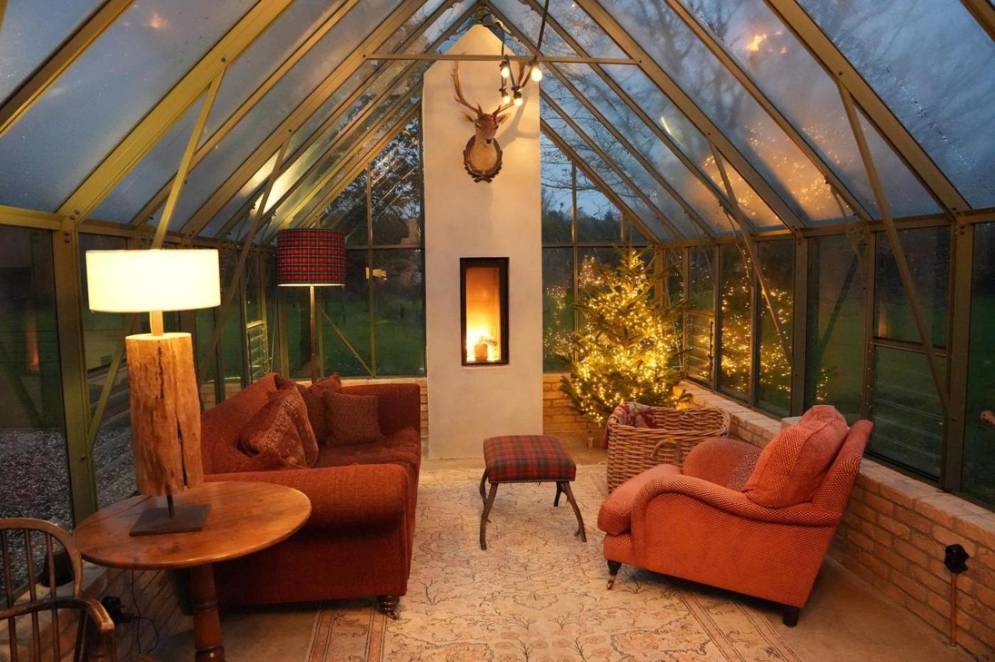 Guests can relax near the outdoor fireplace at the holiday home.