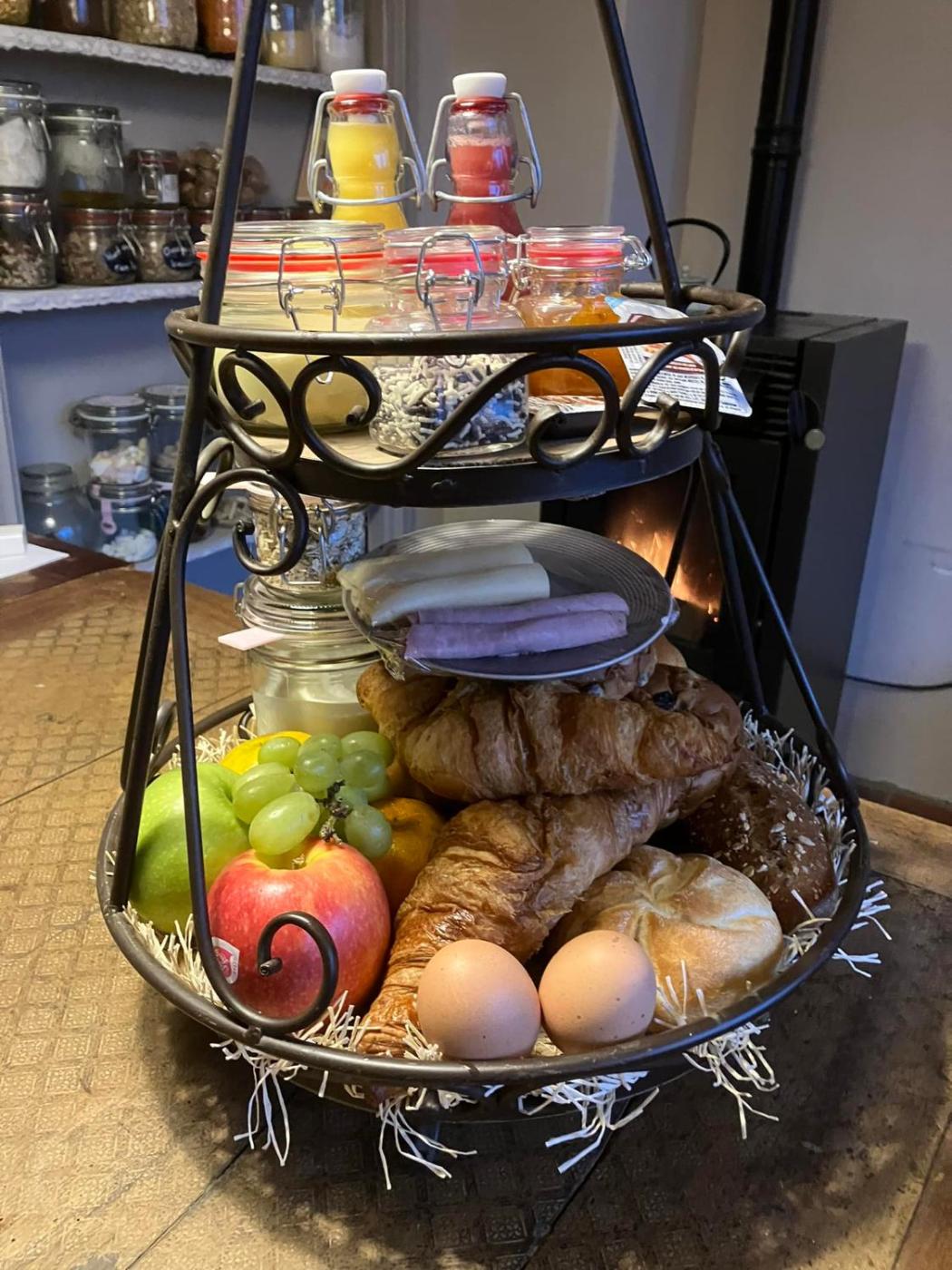 A selection of options including fresh pastries, fruits and juice is served for breakfast, and breakfast in the room is also available.